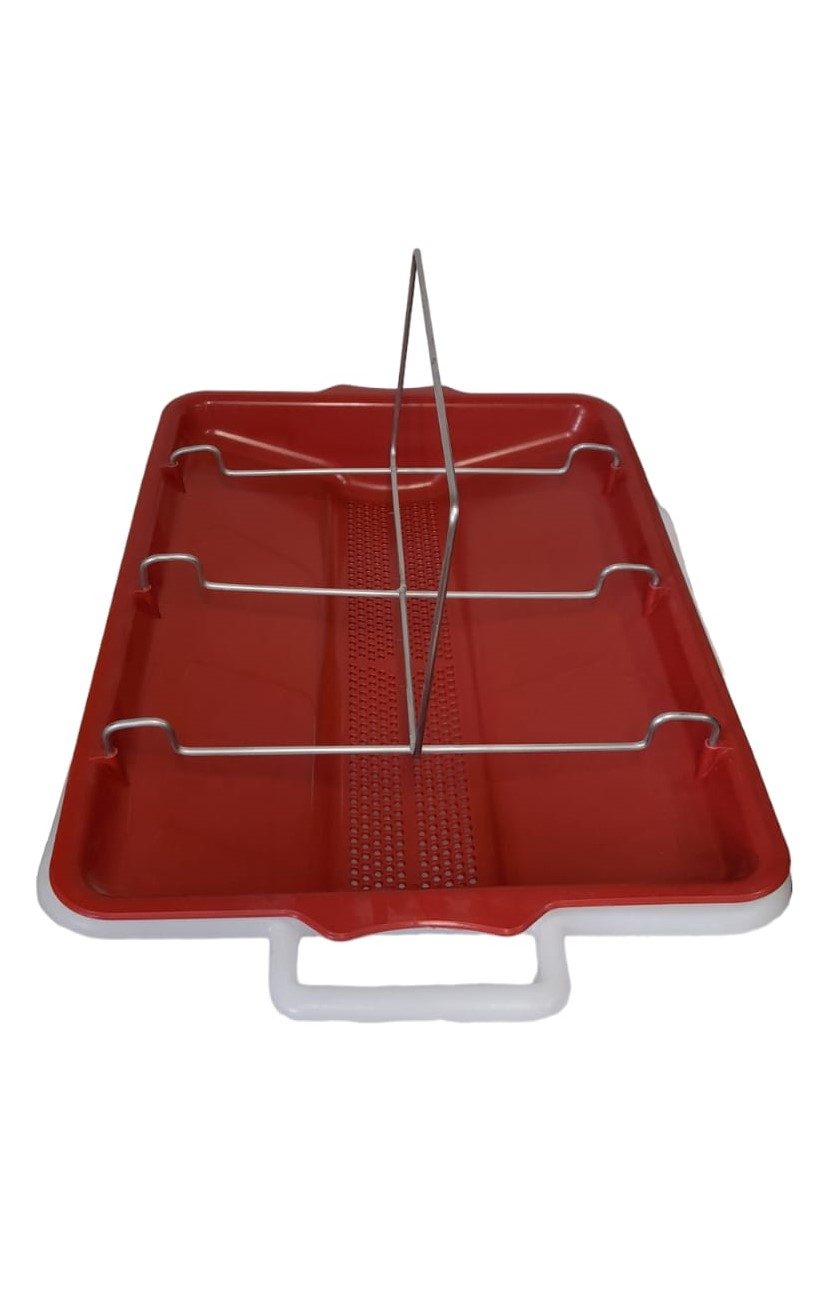 Plastikinė vonelė su uždedamu įdėklu ir įstatomu metaliniu rėmelių stovu. Apatinė vonelė su išlietomis rankenomis (visas ilgis 74 cm). Dydis be rankenų: 62 x 45 x 19 cm. Metalinio stovo aukštis 20 cm, plotis 40 cm.