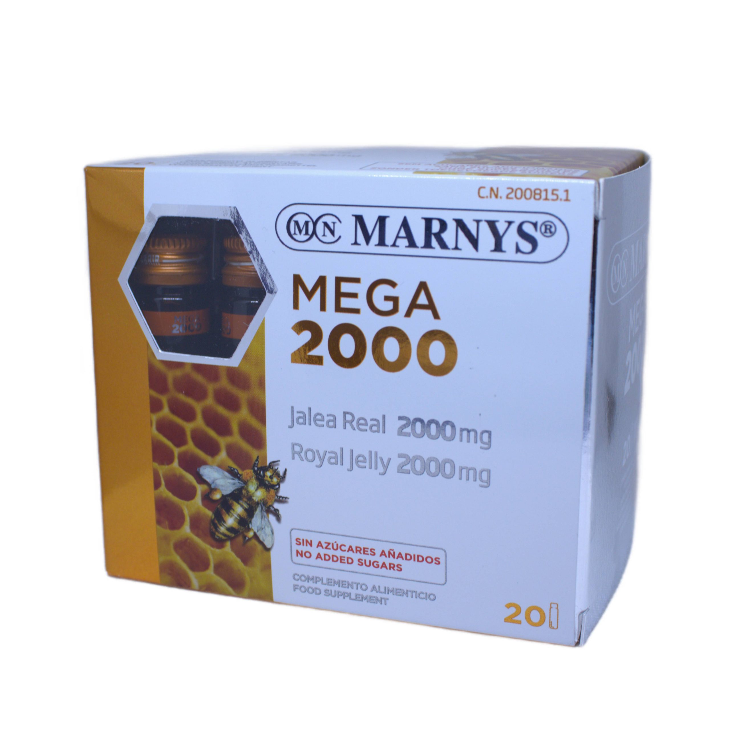 MEGA 2000 mg – tai maisto papildas be pridėtinių cukrų, kurio kiekvieno indelio sudėtyje yra 2000 mg bičių pienelio ir 10 mg vitamino C.