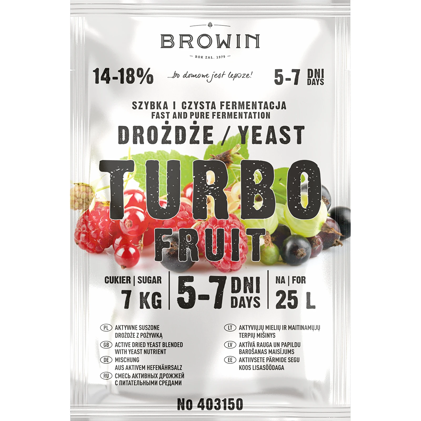 Turbo Fruit 5-7 dienų distiliavimo mielės yra puikus mielių, maistinių medžiagų ir vitaminų mišinys, skirtas greitam fermentavimui. Rekomenduojama fermentuoti baltų ir raudonų vaisių partijas. Tai leidžia per 5-7 dienas gauti 14-18% alkoholio! Gatavas gėrimas taip pat turės vaisių skonį.